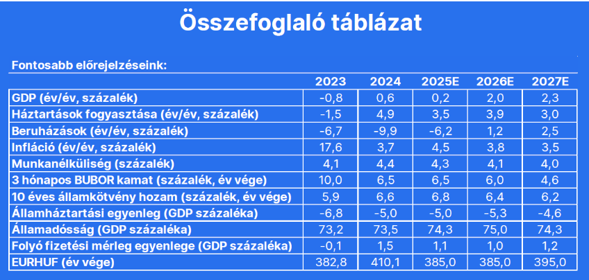 Az idei 0,2 százalék után jövőre 2 százalékkal bővülhet a magyar gazdaság. Az árrésstop esetleges kivezetése átmenetileg megemelheti a pénzromlás ütemét, ugyanakkor a szigorú monetáris kondíciók miatt összességében az átlagos infláció lassulására lehet számítani 2026-ban. A hazai és a külföldi kamatok közti, várhatóan tovább emelkedő különbözet erős támaszt nyújt a hazai fizetőeszköznek. Egy euró idén és jövő év végén is 385 forint körül lehet.