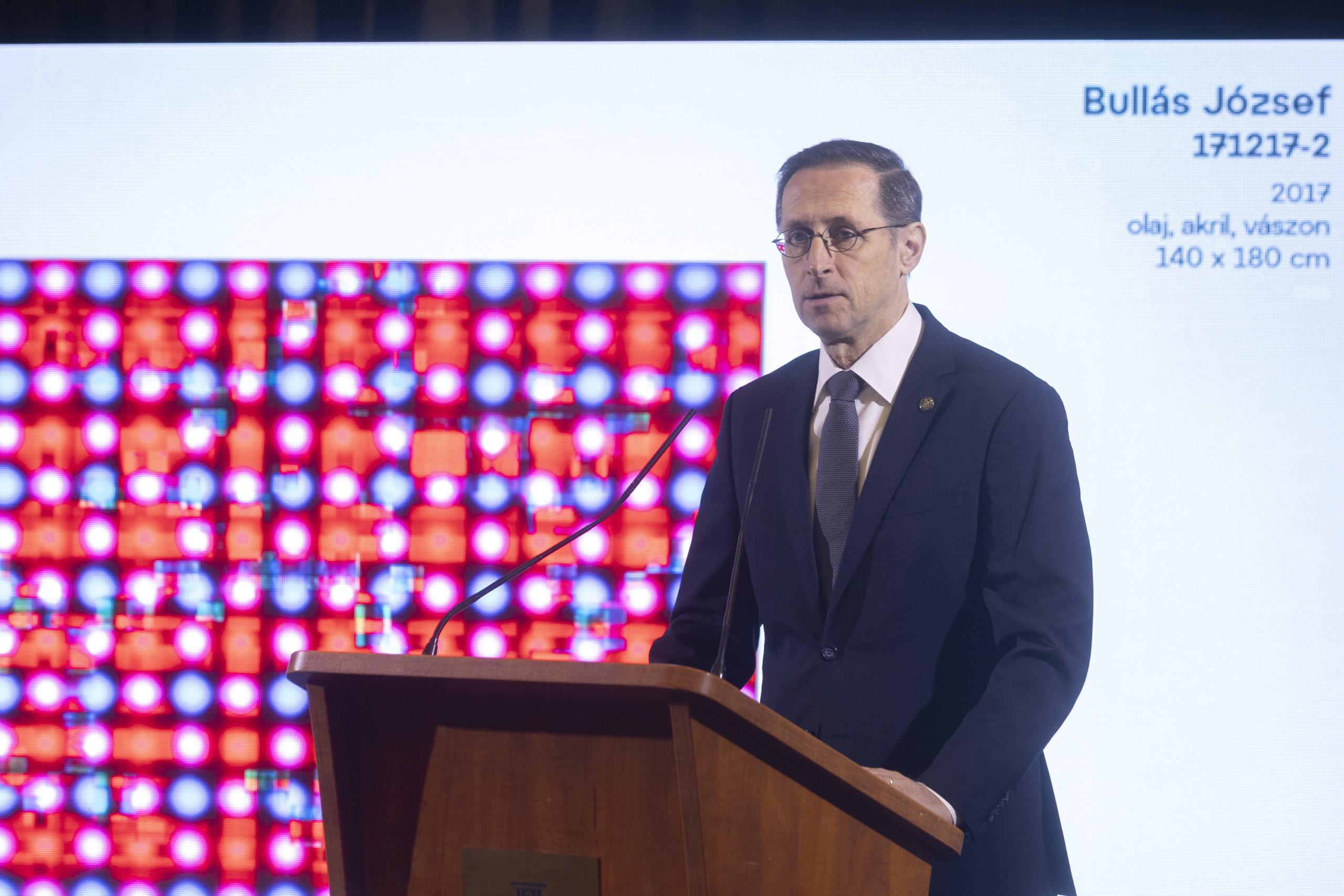 Varga Mihály, a Magyar Nemzeti Bank elnöke beszédet mond a Magyar Nemzeti Bank mûgyûjteményének átadásán a Magyar Nemzeti Galéria épületében 2025. december 19-én. A jegybank 30 múzeumnál helyezi letétbe a tulajdonában lévõ, 1422 kortárs mûalkotásból álló gyûjteményt.