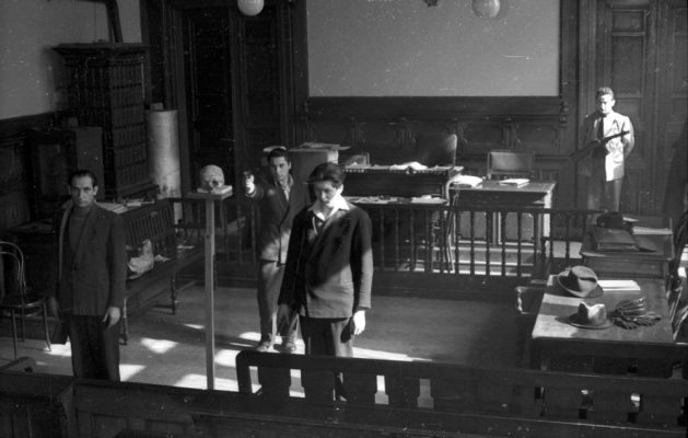 Feltehetően egy szembesítést örökített meg a fotós, és a kép két oldalán, lejjebb, de hasonló pózban álló férfiak legalább annyira markánsan behatárolják a bűncselekmény minőségét, mint az előtérben kornyadozó facsemeték.