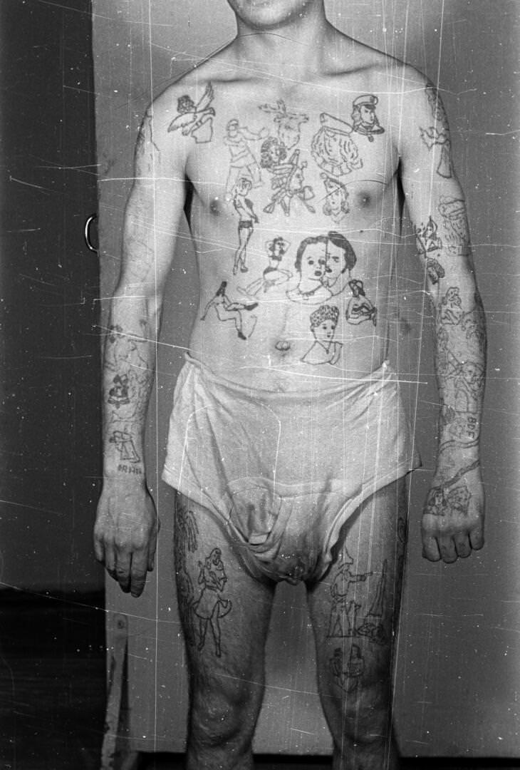 Anélkül, hogy látnánk az arcát, egyértelmű, hogy a szegénység és a bűn tette őt azzá, akit inkább meg sem mutattak. Lehet a tetkókon szörnyülködni, de ugye itt a gatya a lényeg. A tetkókra van magyarázat, és értjük. A gatyára is, de azt meg nem akar(hat)juk érteni.