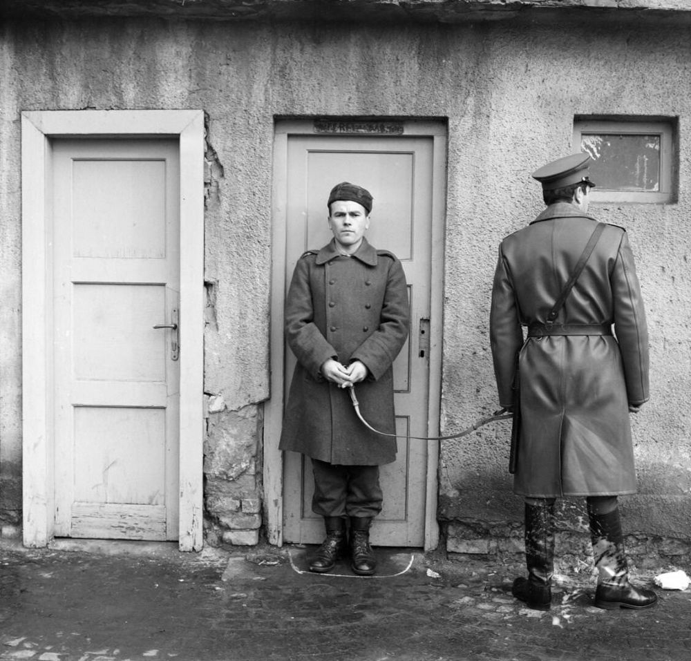 A katona lába elé húzott krétajel alapján nem tudok másra gondolni, mint egy bűntény helyszínére, ami akár egy vidéki vasútállomás férfivécéje is lehetett volna – Kispest helyett. Az elkövető nem lóg ki a képből, nem üt el tőle, szomorú, organikus összhangban áll környezetével.