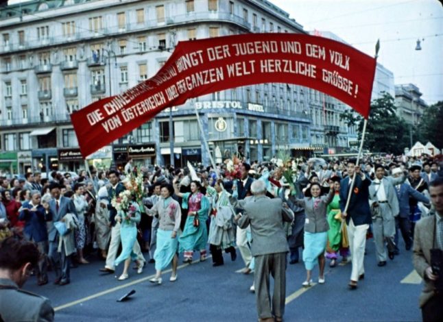 Ebből később sok minden következett a bel- és külpolitikától Bécs ENSZ-várossá válásáig, de ezzel függött össze az is, hogy három évvel a magyar forradalom leverése után Bécsben rendezték meg a szovjet hátterű Világifjúsági Találkozót. Az 1959-es bécsi VIT kivágott képei egyszerre mutatják a Nyugatnak szóló szocialista antiimperialista propagandát, valamint a szovjetellenes ellenpropaganda lenyomatait: a hivatalos delegációk felvonulását és a sarló-kalapácsos vörös polipot az utcai plakátokon.