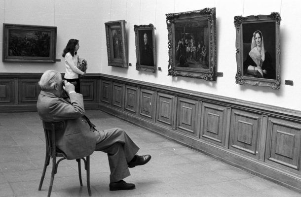 Waldmüller György Ferdinánd Szentgyörgyi Imréné arczképe című festménye és rajongója a Szépművészeti Múzeumban 1983-ban. #192727 Fotó: Fortepan / Kriss Géza