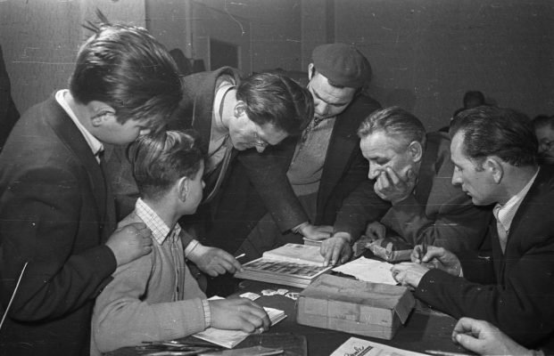 Bélyeggyűjtőklub a Vasas Kultúrházban (később Csili Művelődési Központ) 1955-ben. #127751 Fotó: Fortepan / Bauer Sándor