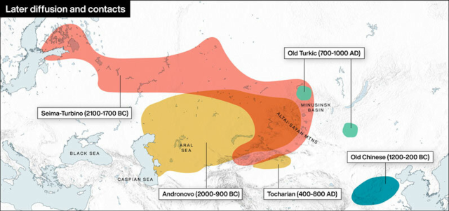 A bronzművességhez kapcsolódó kultúrkörben uráli (finnugor és szamojéd), paleoszibériai, iráni és esetleg török elődnépek is benne voltak. Ez a kulturális konglomerátum az, amelyik átjutott Európába (ilyenkor elsősorban az Uráltól nyugatra levő területekre gondoljunk, illetve az ott lakó népekre).