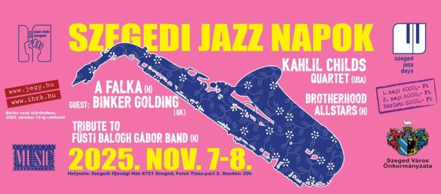 A hétvégén ismét felpezsdül a szegedi IH Rendezvényközpont, ahol a Szegedi Jazz Napok a műfaj legizgalmasabb irányzatait vonultatja fel. A nyitóesten az Egri János vezette Tribute to Füsti Balogh Band tiszteleg a fiatalon elhunyt zongorista emléke előtt, majd a Falka zenekar és a brit vendég, Binker Golding varázsolja el a közönséget. Szombaton a Brotherhood Allstars Quintet hozza el a hazai dzsessz legjavát, végül a mindössze 16 éves amerikai szaxofoncsoda, Kahlil Childs lép színpadra saját szerzeményeivel. Egy hétvége, ahol a jazz újra élőben szól – eredeti, virtuóz és szívből jövő.